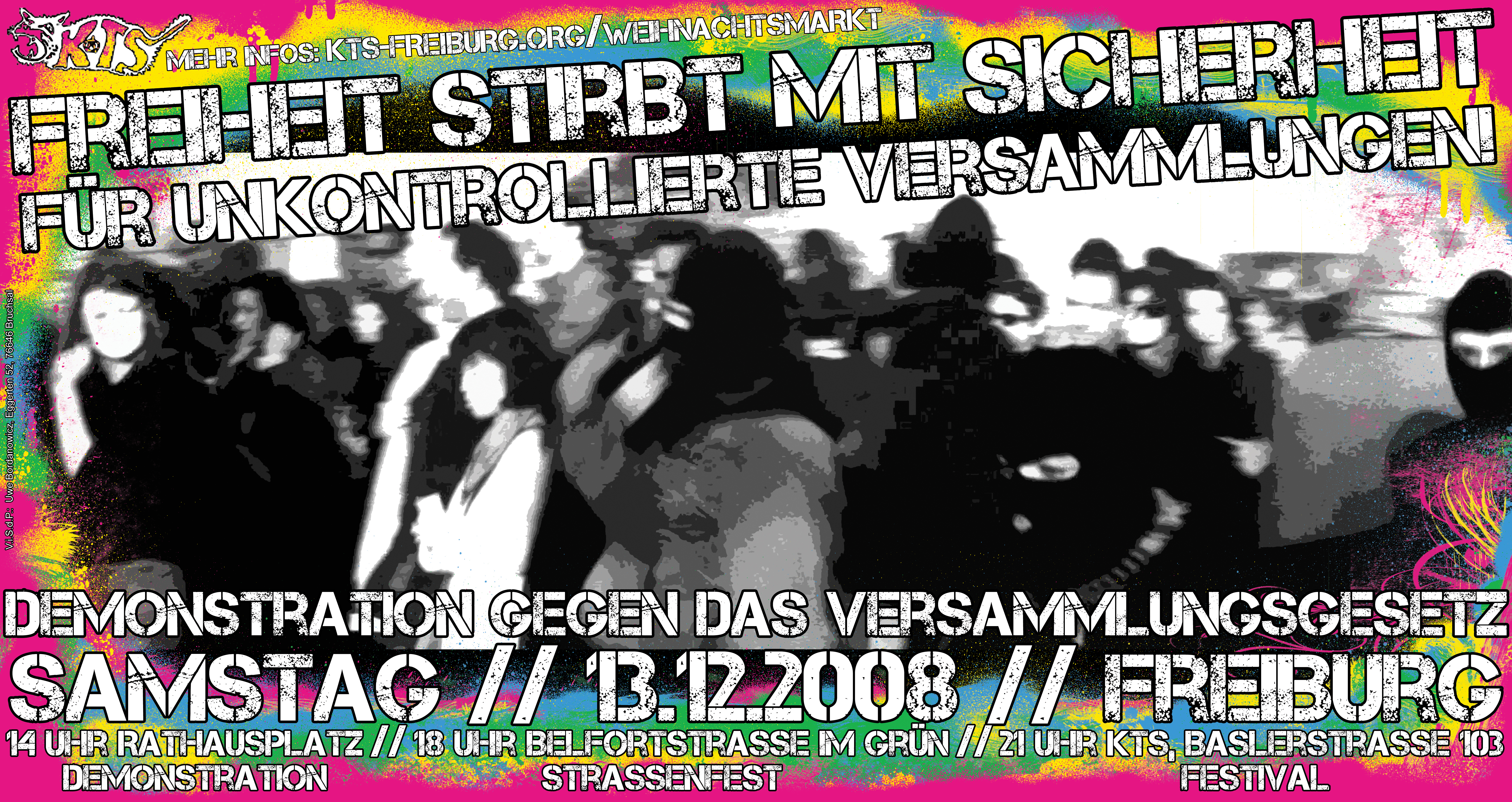 Im Rahmen der Proteste gegen das neue Versammlungsgesetz in Baden-Württemberg rufen wir am 13.12.2008 zu einer Demonstration in Freiburg auf. Los gehts um 14 Uhr auf dem Rathausplatz. Im Anschluß gibt es leckeres Essen, warme Getränke und heiße Musik auf einem kleinen Straßenfest in der Belfortstraße im Grün.